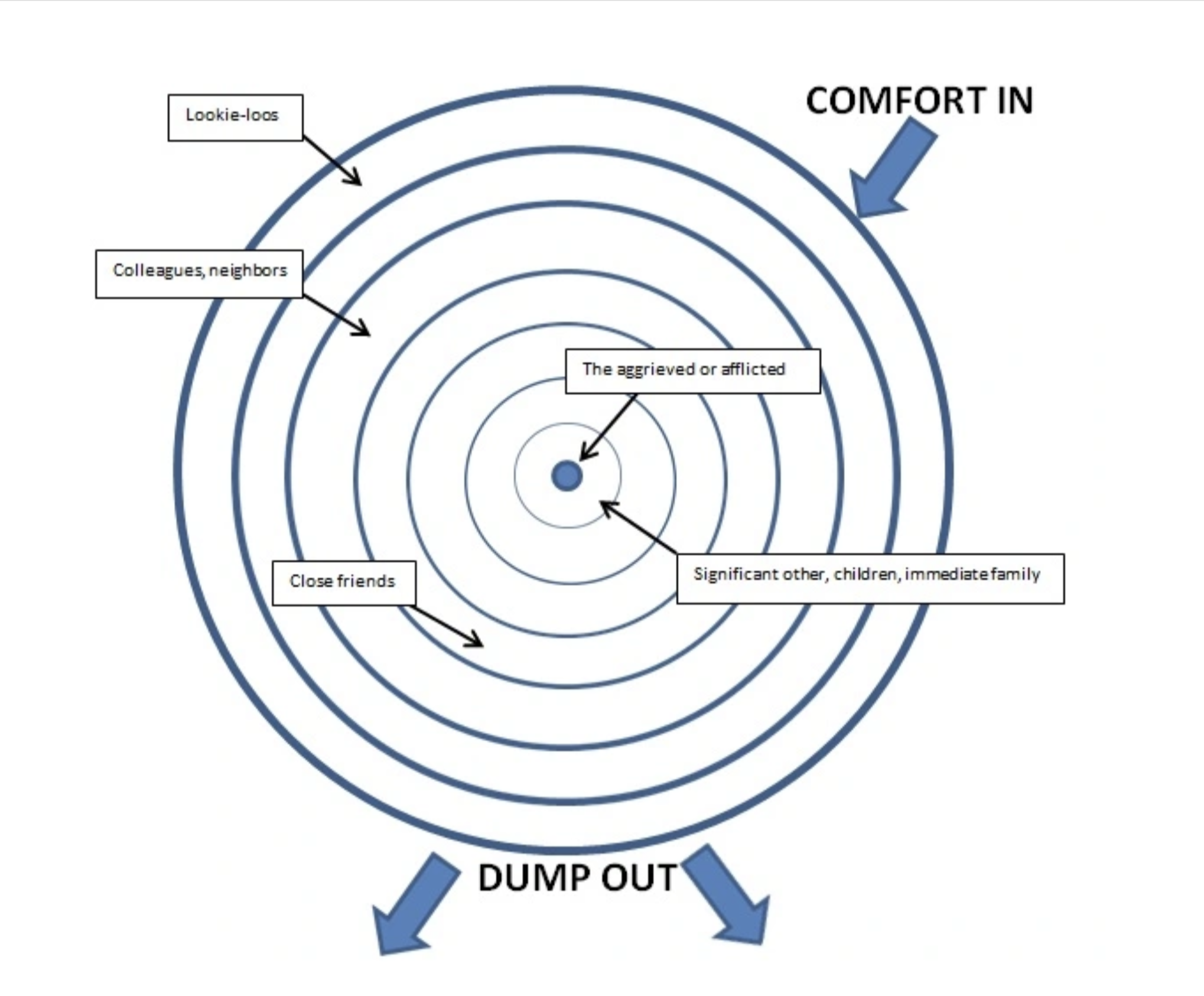 So many people said the wrong thing.  In the piece, the writer talked about putting concentric circles around the person or people going through the crisis, labeling the larger ones with those people farther away from the epicenter of the situation.  The closer the person is to the crisis, the smaller their circle.  They encourage people to offer comfort and help to anyone in a smaller circle than their own, and to lament or complain or vent only to people in bigger circles.  Comfort in, dump out.