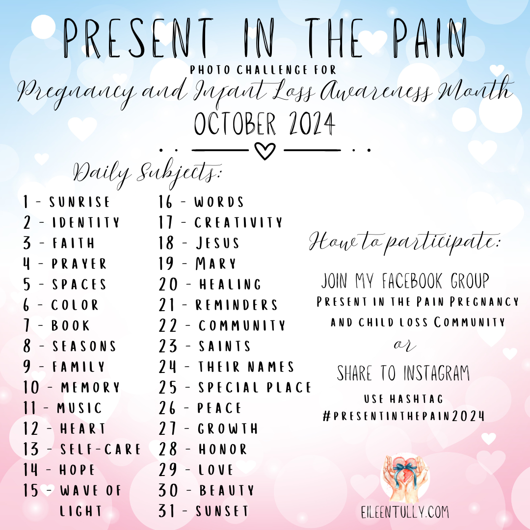 In honor of Pregnancy and Infant Loss Awareness Month, let's process our pain by taking one photo per day for the month of October on each of the subjects listed in the graphic and sharing them - either by themselves, with a few words, or with a brief reflection.